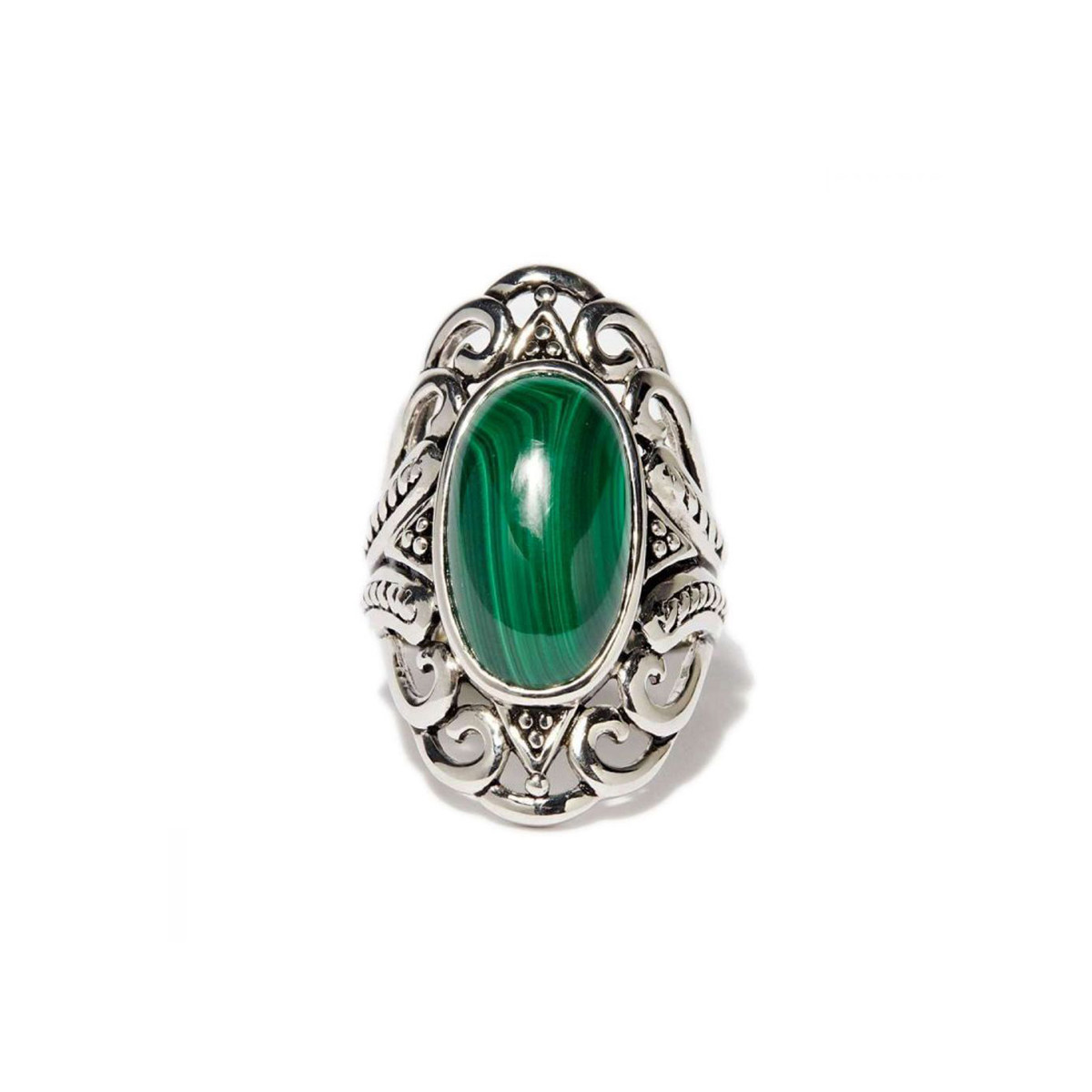 Optez pour un look bohème grâce à cette bague de style ethnique en argent massif avec plateau ovale et design filigrane montée d'une pierre centrale de malachite de forme ovale, le bijoux idéal pour apporter de la couleur à vos tenues.