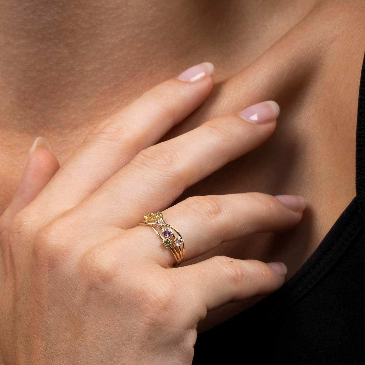 La bague de 1,1 g d'Or Jaune 375, ornée de Citrine, Péridot, Topaze Blanche & Améthyste 0,54 carat et Diamants est un bijou mixant finesse, élégance et raffinement discret. Elle sera livrée dans son écrin, accompagnée de son certificat de garantie de 12 mois.