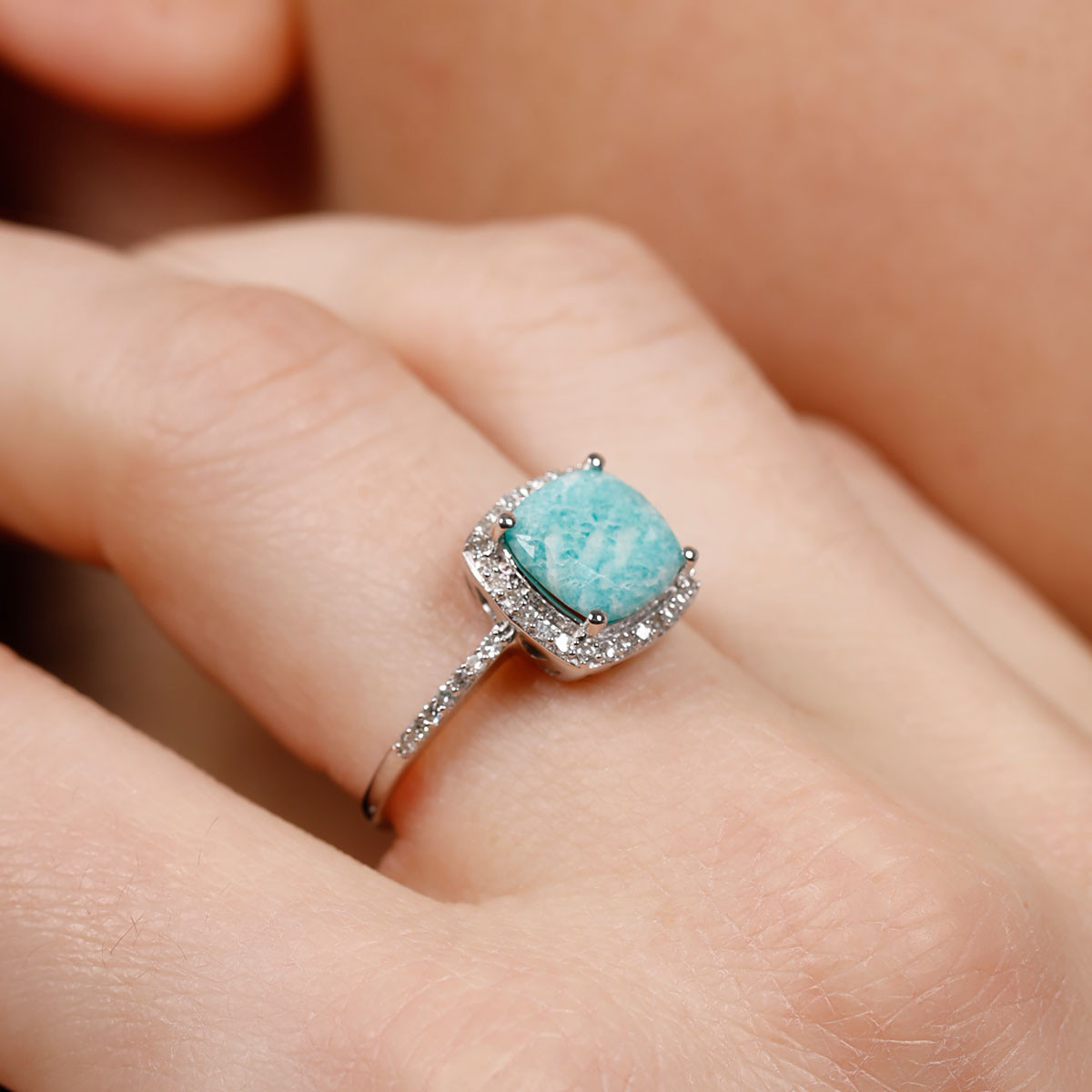 Sublime bague en Or Blanc sertie de 1 amazonite de 2 carats et de diamants pour un total de 0,22 carat.