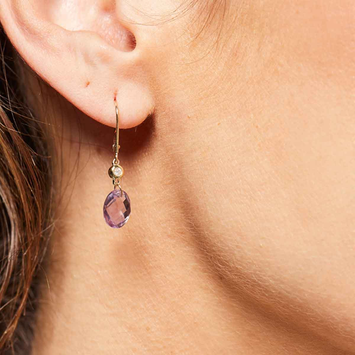 Sublimes boucles d'oreilles pendantes en Or Jaune serties d'améthystes et de diamants.