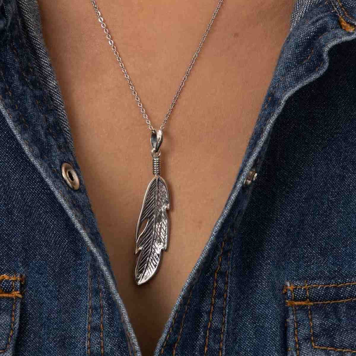 Magnifique pendentif en argent massif en forme de plume avec détails ciselés. Une chaîne en argent 925 vous sera offerte avec ce pendentif.