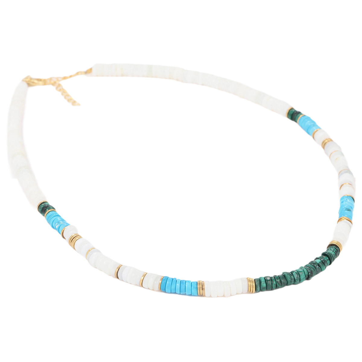Venez découvrir notre collier en laiton doré monté d'Opale, Turquoise et Malachite.