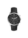 Cette montre Neutra de 44 mm arbore un cadran satiné noir avec des index en forme de bâtons, un mouvement chronographe et un bracelet interchangeable en cuir assorti.