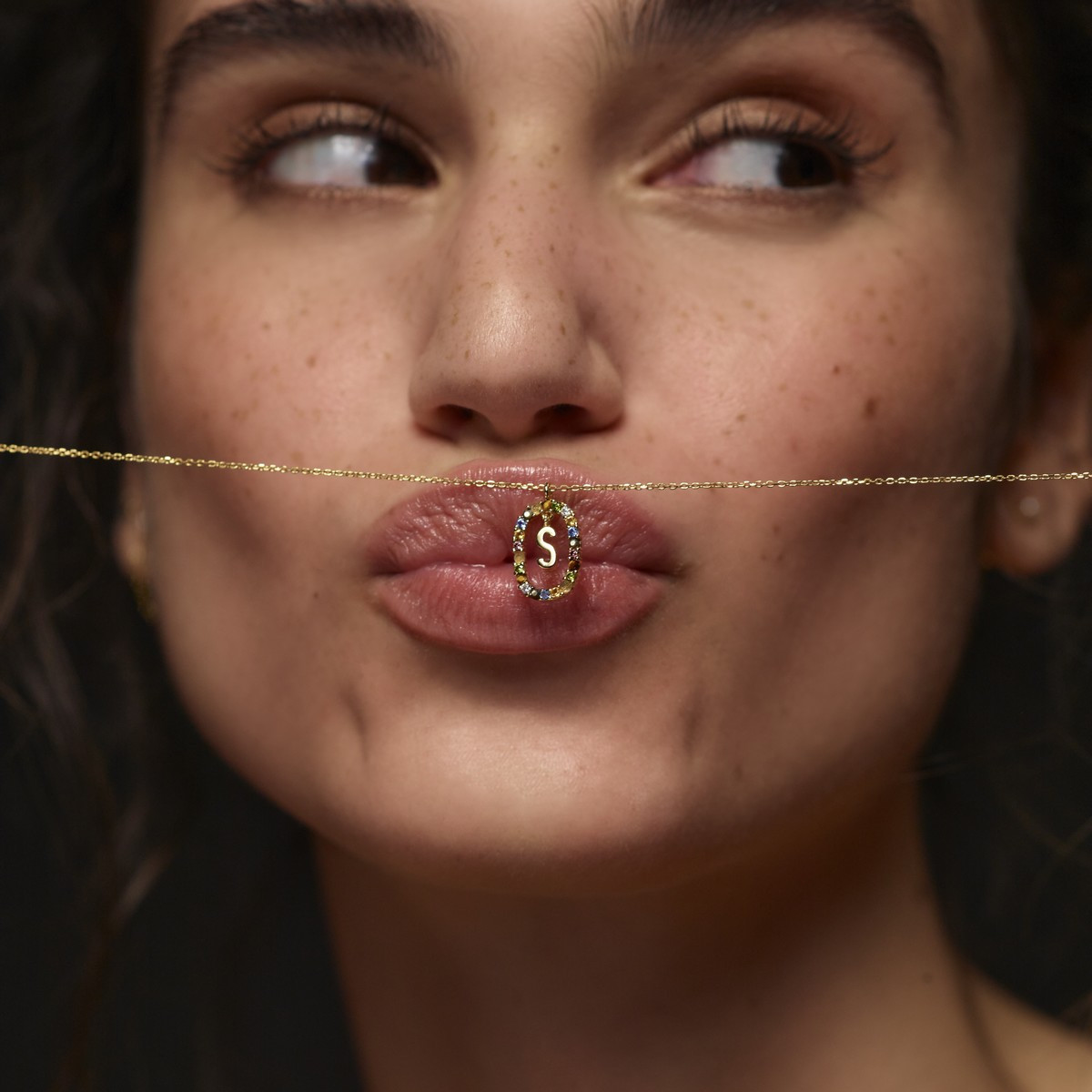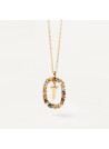 Collier collection New Letters lettre T en argent sterling925 doré à l'or fin 18k avec pierres naturelles et semi-précieuses œil de tigre, Labradorite, Nacre et cristal Cristal jaune doré, Cristal vert, péridot, Cristal vert olive, Cristal bleu, spinelle, Cristal violet, rhodolite et Cristal blanc pur.