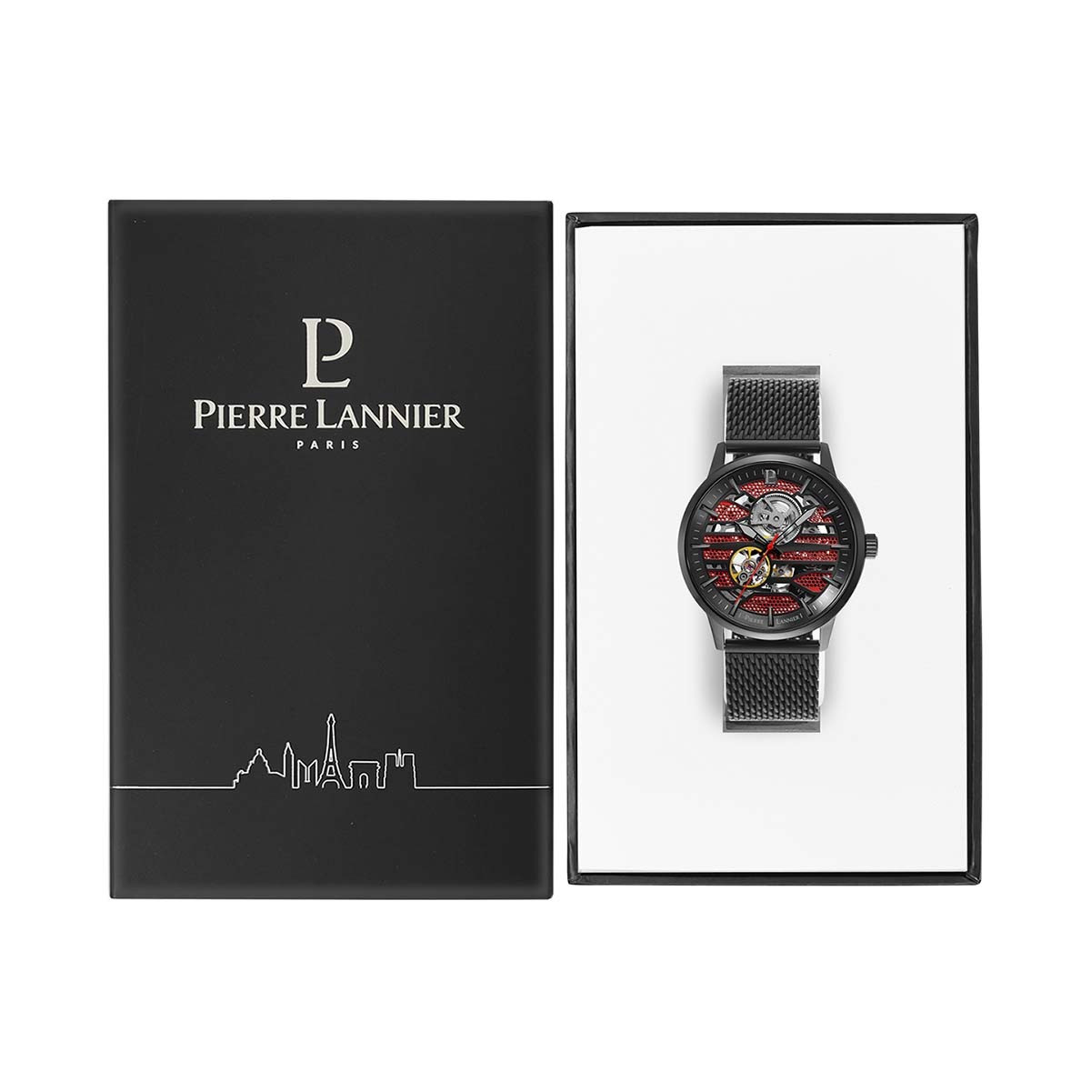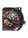 Mouvement automatique, cadran squelette, façon "nid d'abeille" de couleur rouge, boitier en acier inoxydable noir.