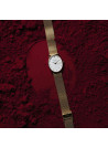 Boîtier ovale 24x29 mm de diamètre en métal doré, cadran nacre et bracelet en acier doré, Quartz, étanche 3 ATM.